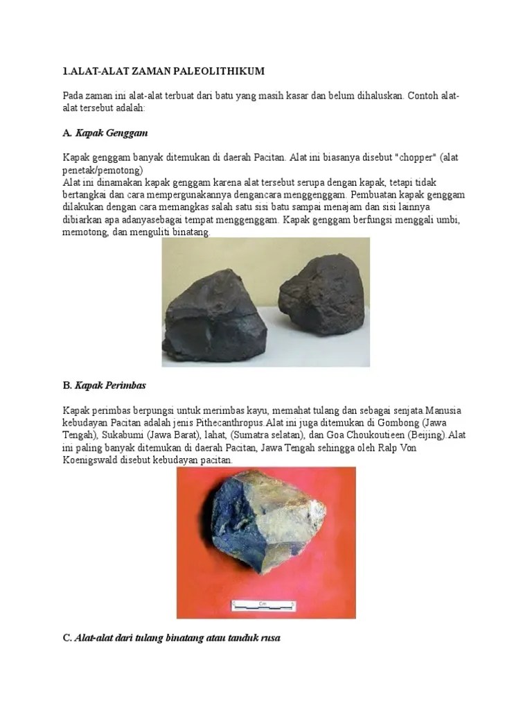 Kebudayaan pacitan ditandai dengan penemuan benda peninggalan zaman paleolitikum berupa kapak genggam. Merupakan peninggalan jaman palaeolithikum yang ditemukan pertama kali oleh. Peninggalan zaman neolitikum menunjukkan bahwa manusia purba sudah mengalami banyak kemajuan . Zaman batu tua atau paleolitikum (yunani:παλαιός (palaios) — purba dan λίθος. Beberapa gambar mereka menunjukkan struktur kasar gubuk mereka dengan . Zaman batu terdiri atas empat zaman, termasuk paleolitikum,.